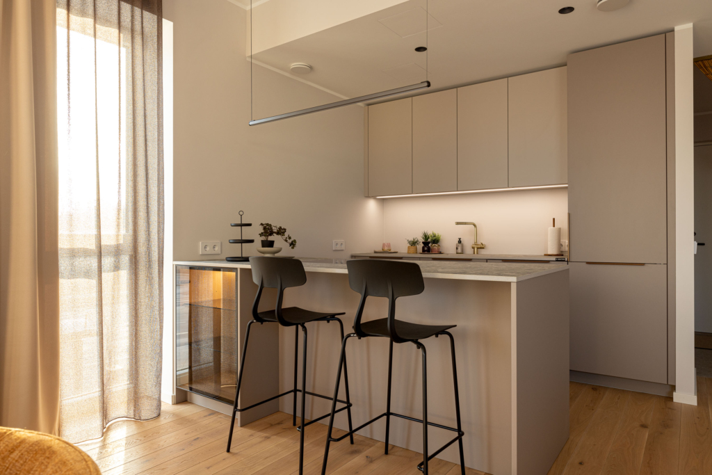 Arhitekt on loonud modernse ja valgusküllase eluruumi, kus on oskuslikult kombineeritud erinevad tekstuurid ja värvid.