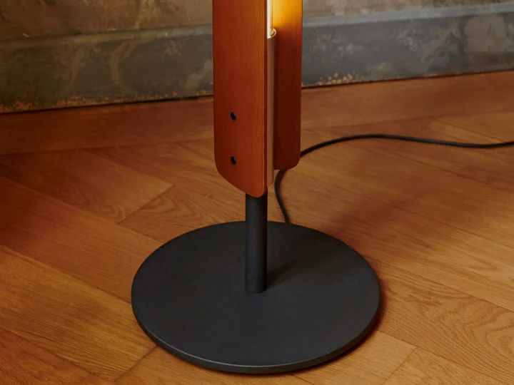 Valgusti detailid ja rosett on valmistatud poleeritud ja spetsiaalse tsapoonlakiga kaetud alumiiniumist, alus aga mustast rauast. Need nüansid annavad valgustile elegantse ja modernse puudutuse, mis on harmoonilises kontrastis puidu loomuliku soojusega.