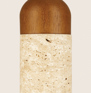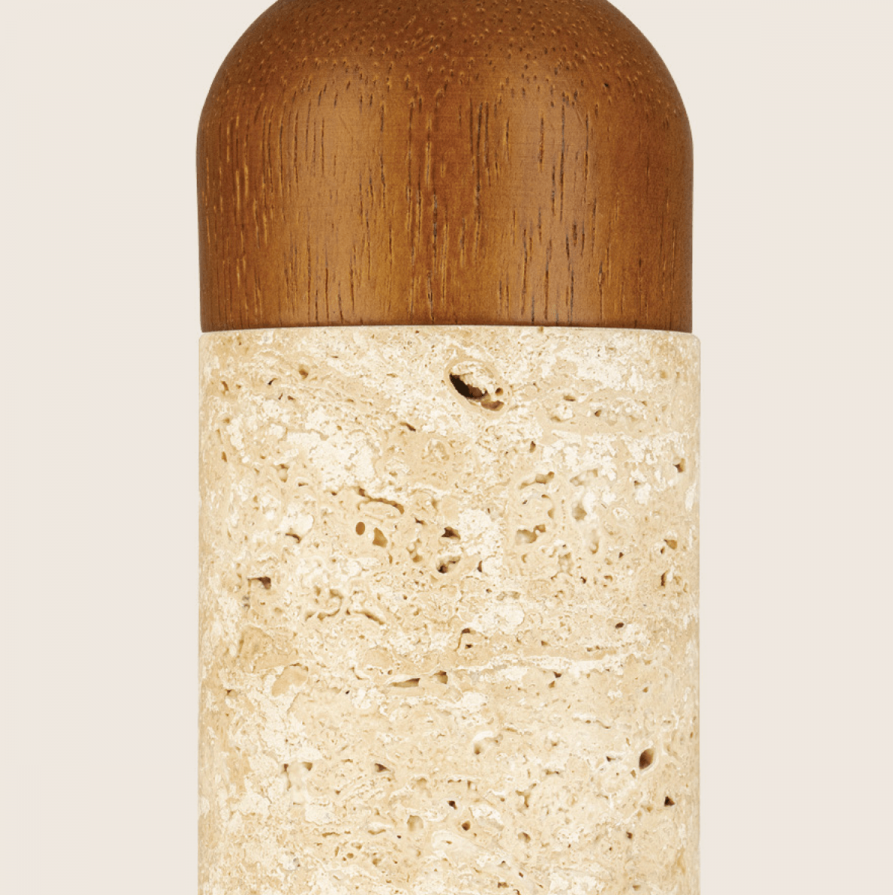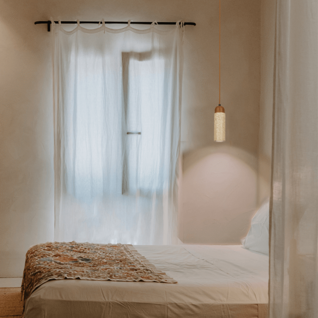Kivist kupliosa ja puidust detailidega rippvalgusti.
