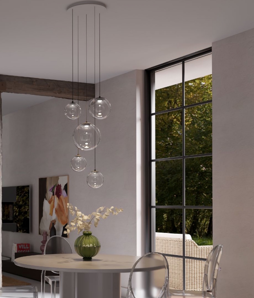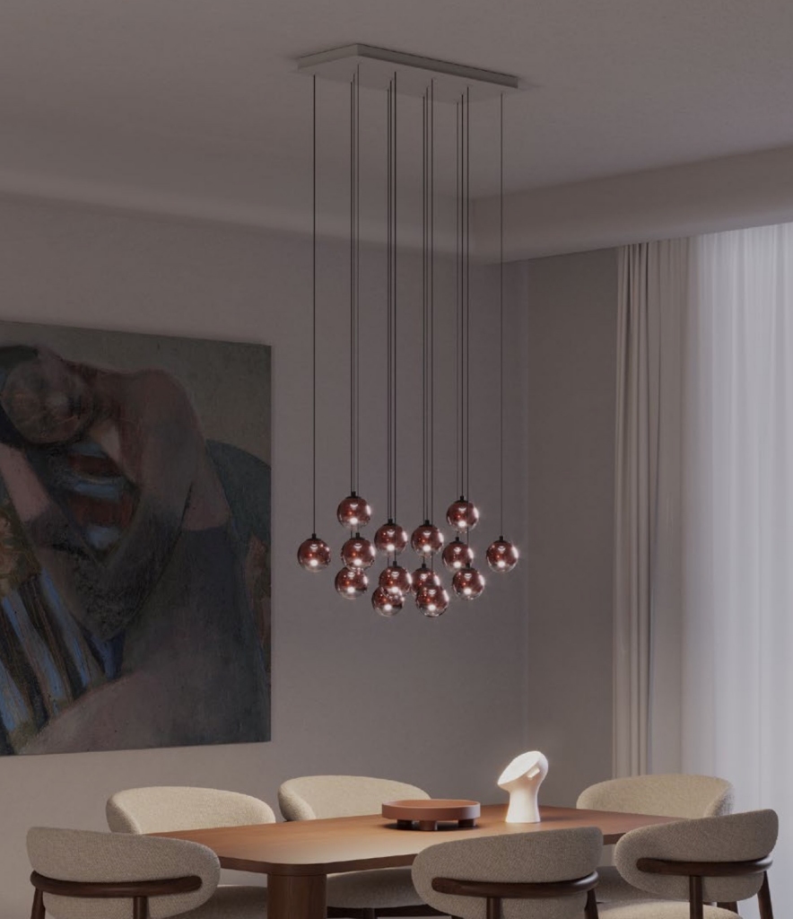 Valgusti on matt-mustaks värvitud alumiiniumist. Saadaval mitut versiooni puhutud klaasist kuplitega nagu läbipaistev, suitsukollane, kohvikollane, opaalvalge või dikroilise ( e.kahevärvilise) töötlusega.