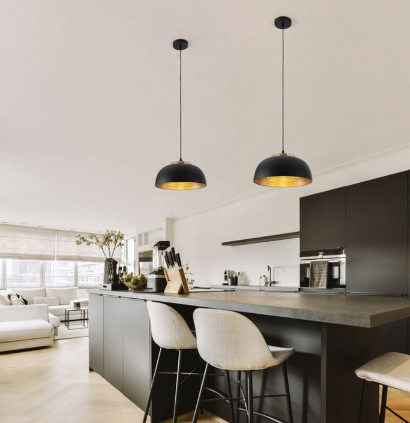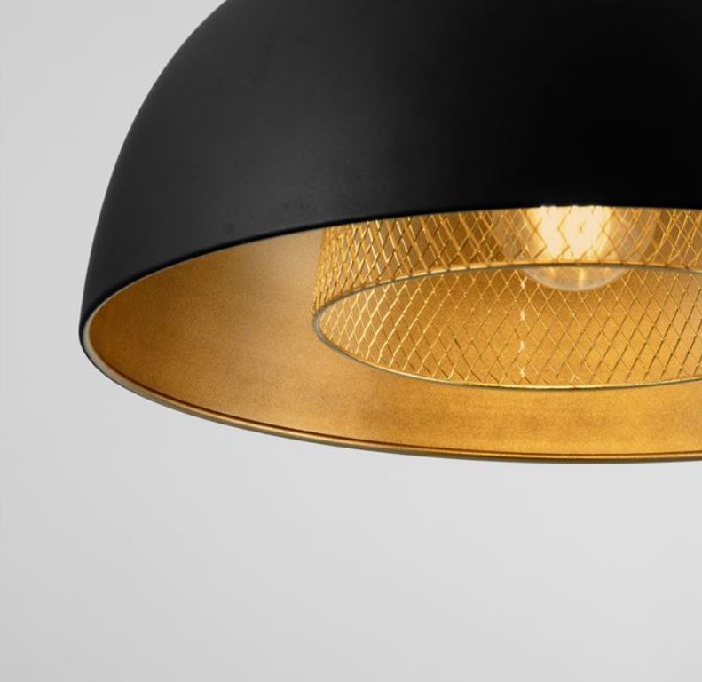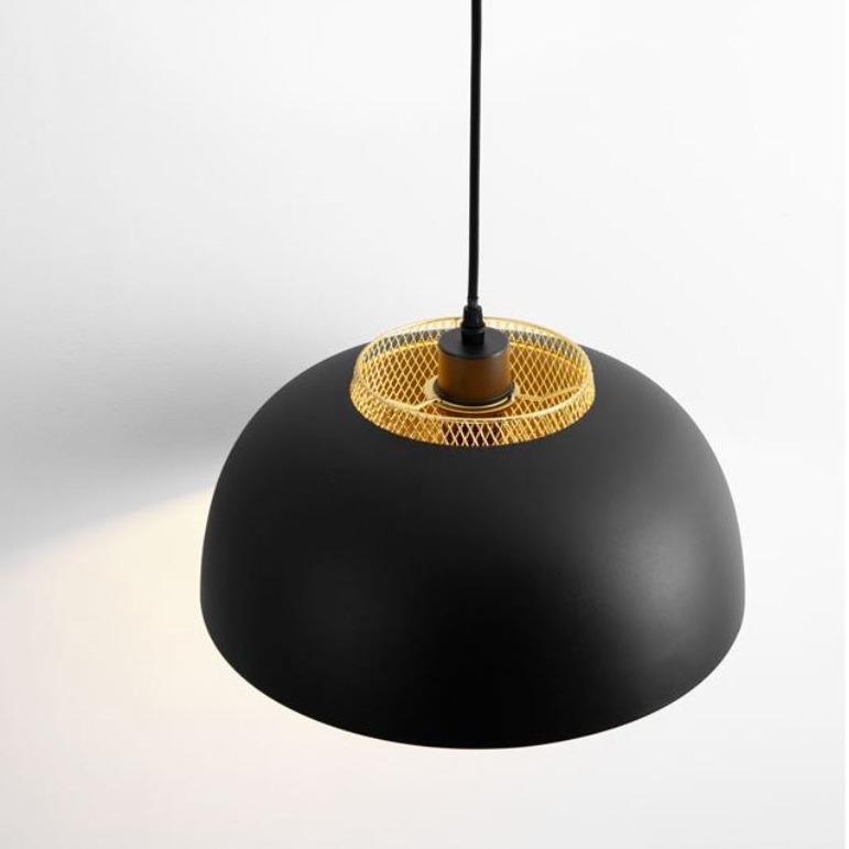 Mustaks värvitud metallist kupli ja kuldsest võrgust detailidega rippvalgusti.