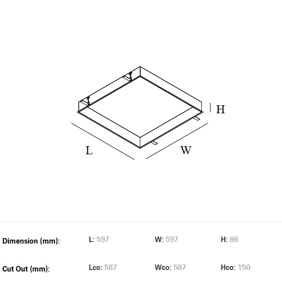 Süvisvalgusti mõõt: 597x597mm.