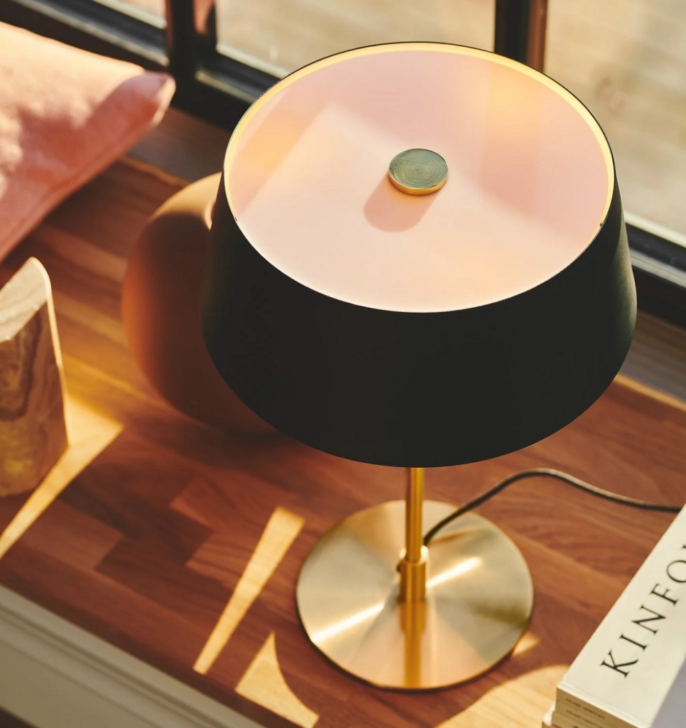 Matt-messingust aluse ja mustast metallist kupliga lauavalgusti.