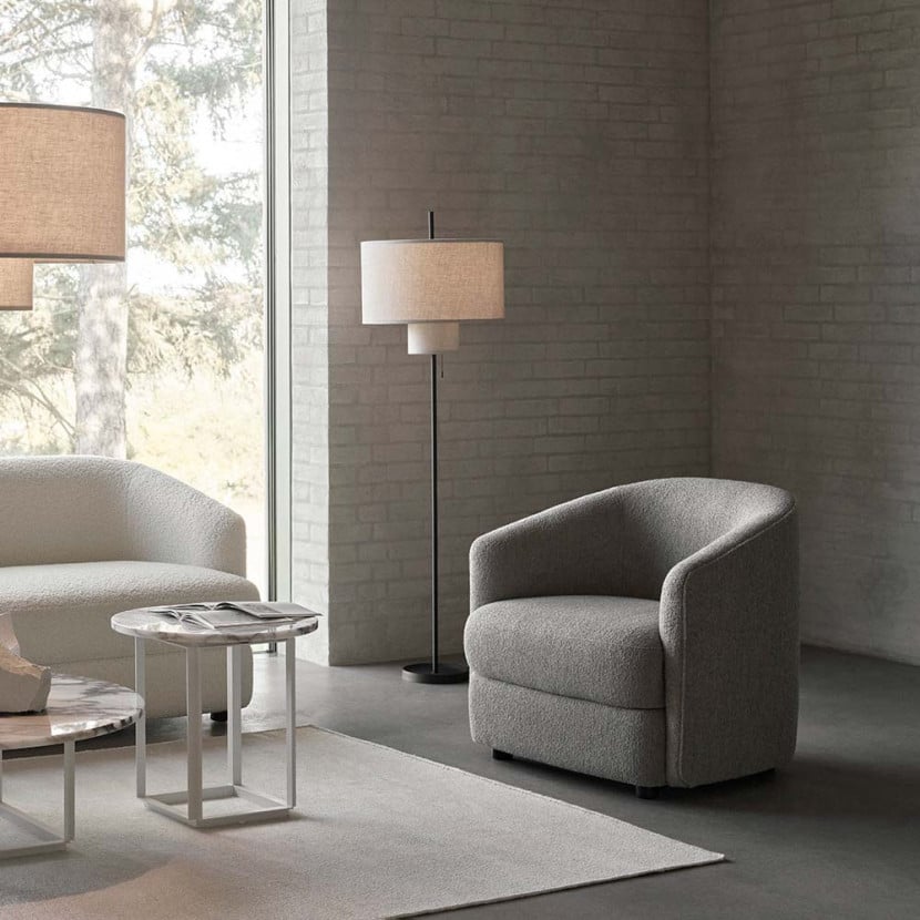Margin põrandavalgustil on kasutatud beežist tekstiilist kuplit ning tänu kupli astmelisele disainile on valgus hajutatud,